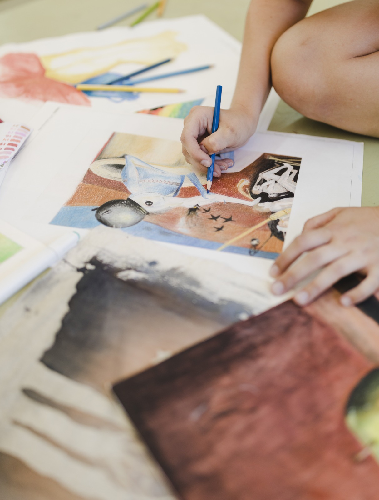 Desenho e pintura com lápis de cor, pastel seco, nanquim, carvão, grafite e técnica mista. Estudo de linhas, hachuras, claro-escuro, contraste, degradê, stencil, desenho de observação, composições cromáticas, desenhos livres e criativos. Desenho da figura humana, anatomia vegetal e animal, ilustração. Introdução à teoria da cor e história da arte.