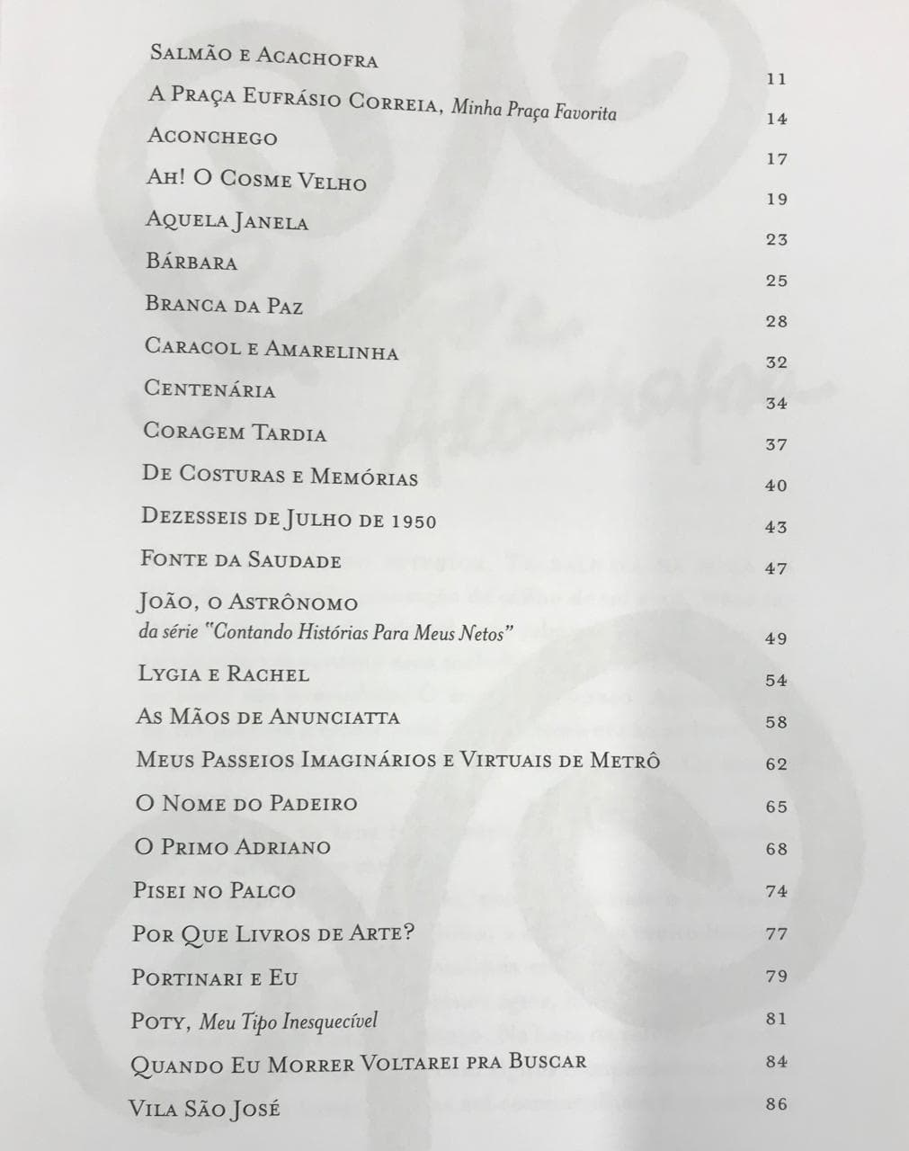 "Regina, que ama janelas, generosamente nos oferece, em Salmão, Alcachofras e outras Histórias, pequenas e preciosas janelas para sua vida e seu modo todo especial de ver e viver o mundo. Janelas que, com certeza, agregarão uma legião de amigos, admiradores e curiosos. Que essa "coragem tardia" em escrever perdure e que venham outras, muitas outras memórias."