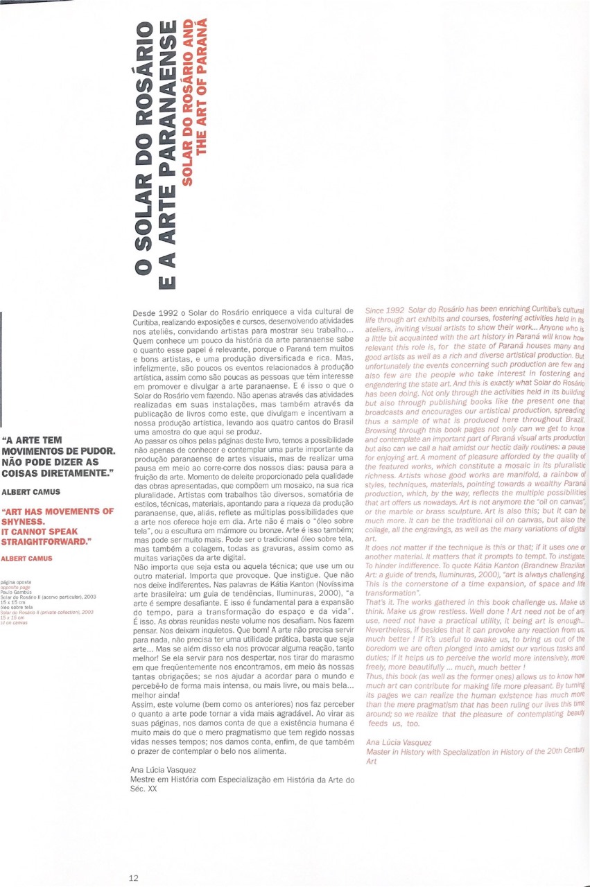 "Quando iniciamos a publicação da coletânea Pintores Contemporâneos do Paraná há exatamente cinco anos, tínhamos em mente um ousado e sonhado objetivo: editar um livro por ano, apresentando ao público geral um pouco da arte dos artistas do Paraná e, ao mesmo tempo, homenagear, em cada volume, dez artistas plásticos que trabalham constantemente com o Solar do Rosário - espaço de arte e cultura (...)
